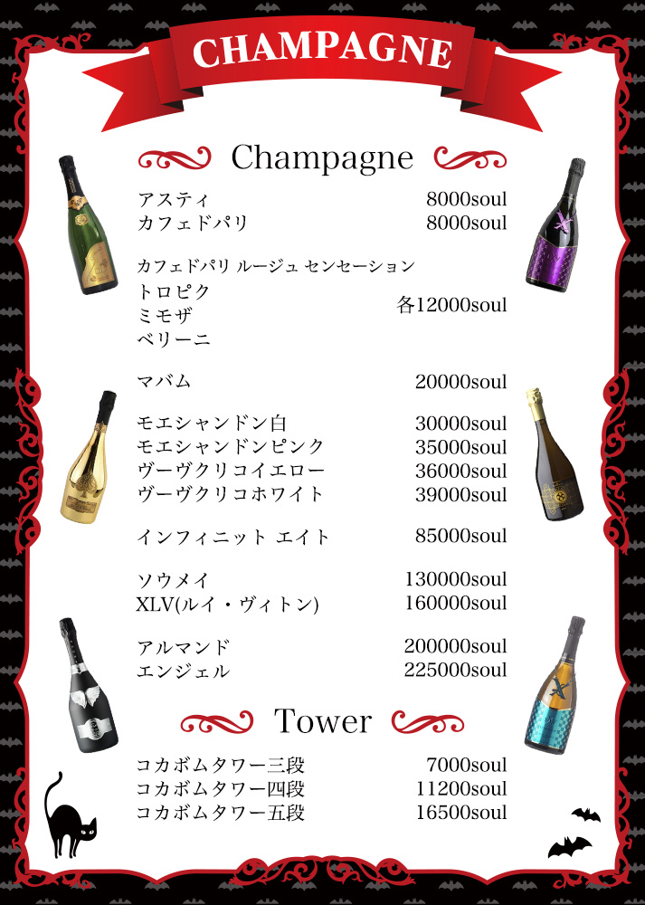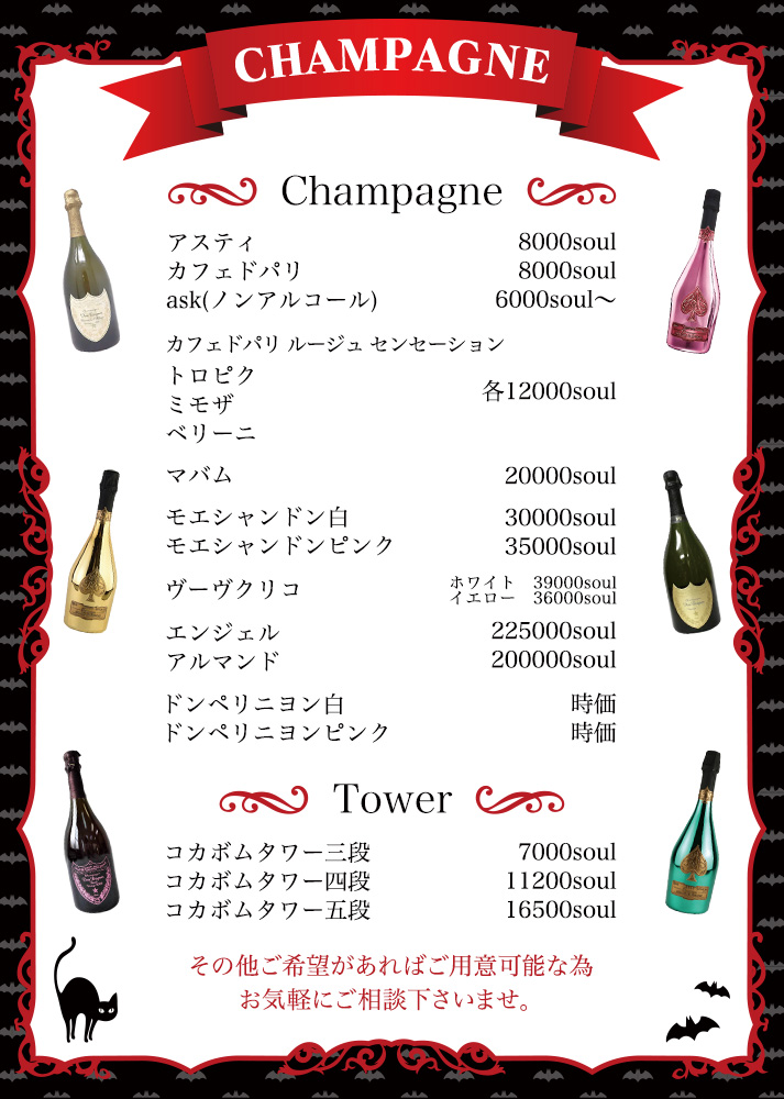 ※シャンパンに関しましては、各種情勢の変化に伴い、店舗での表示価格と異なる場合が御座います。 何卒、ご理解の程、宜しくお願い致します。 最低料金例 ・シーシャ吸わない(1H) 1Hチャージ1,000円 ソフトドリンク600円 TAX10% 1,760円 ・シーシャ吸う(2H) 2Hチャージ1,000円 ソフトドリンク600円 シーシャ(ノンニコチン)1,500円 TAX10% 3,410円